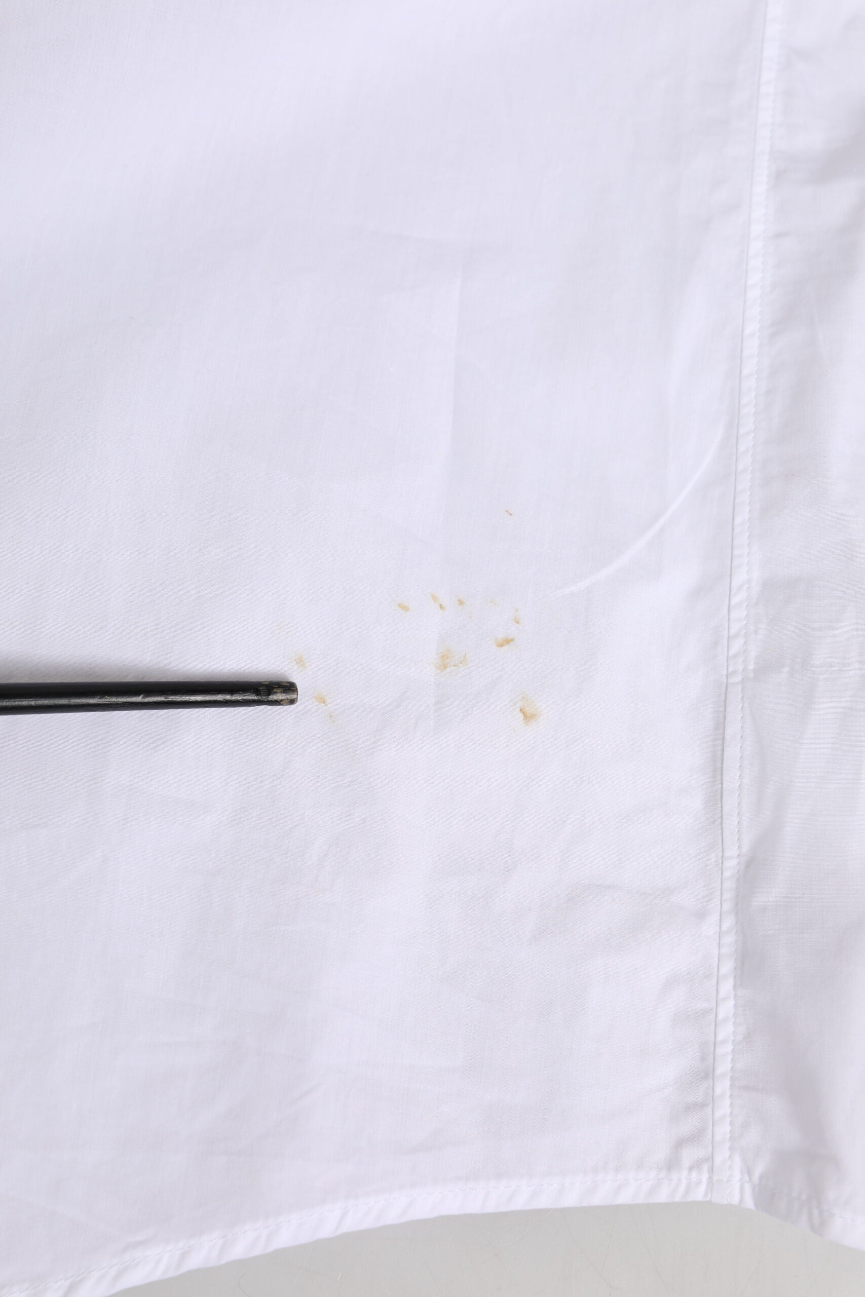 This item has a minor defect, there is a stains around the collar buttonhole, marks on the lower back, and discoloration on the cuff (see pictures for details).
